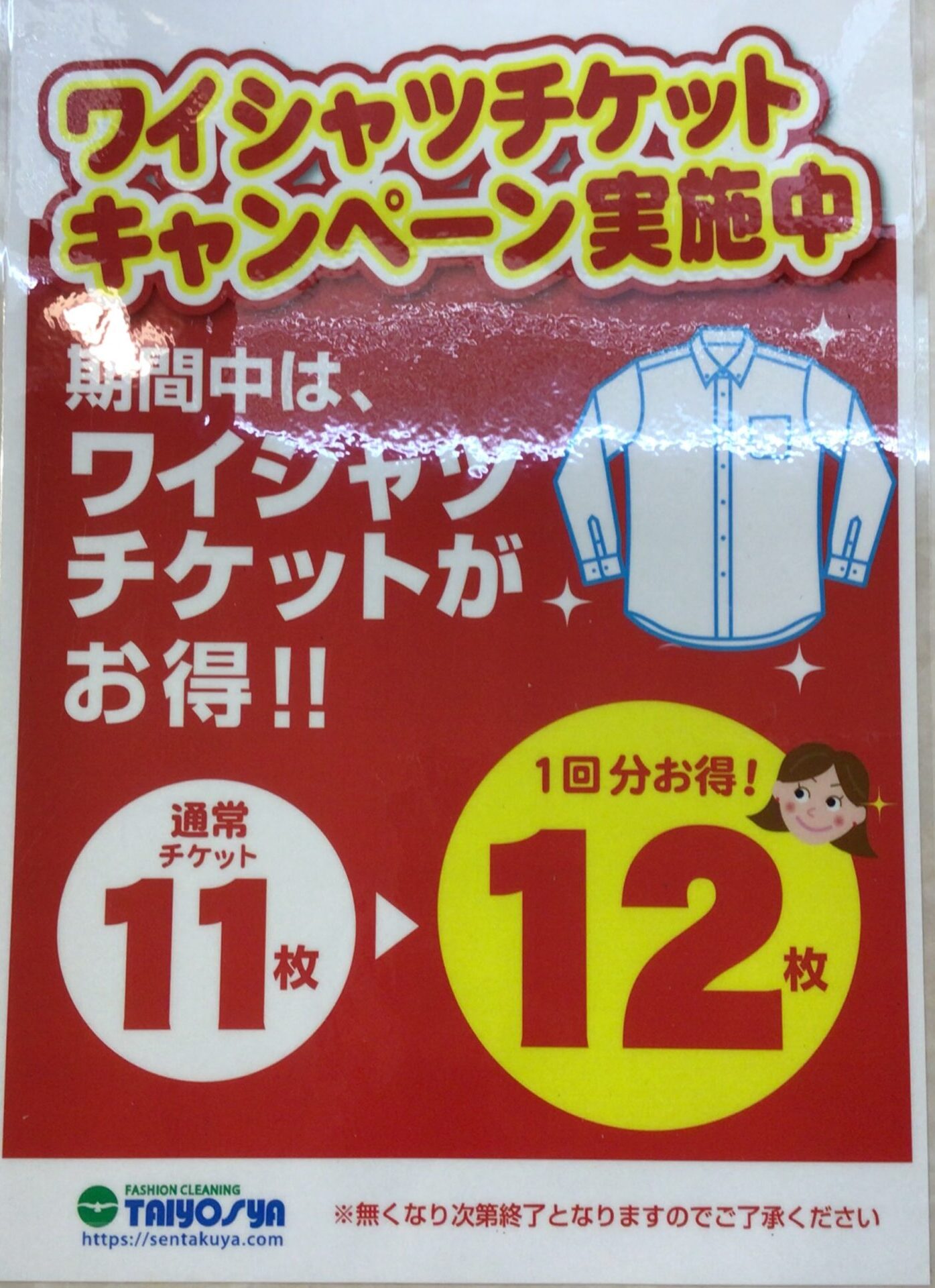今日からワイシャツチケットキャンペーンが始まりました。ワイシャツ10枚分のお値段(¥2,420)で、12枚綴りのワイシャツチケットが購入出来ます。2/28までの販売となっております。ぜひお買い逃しのないよう、ご来店お待ちしております。
