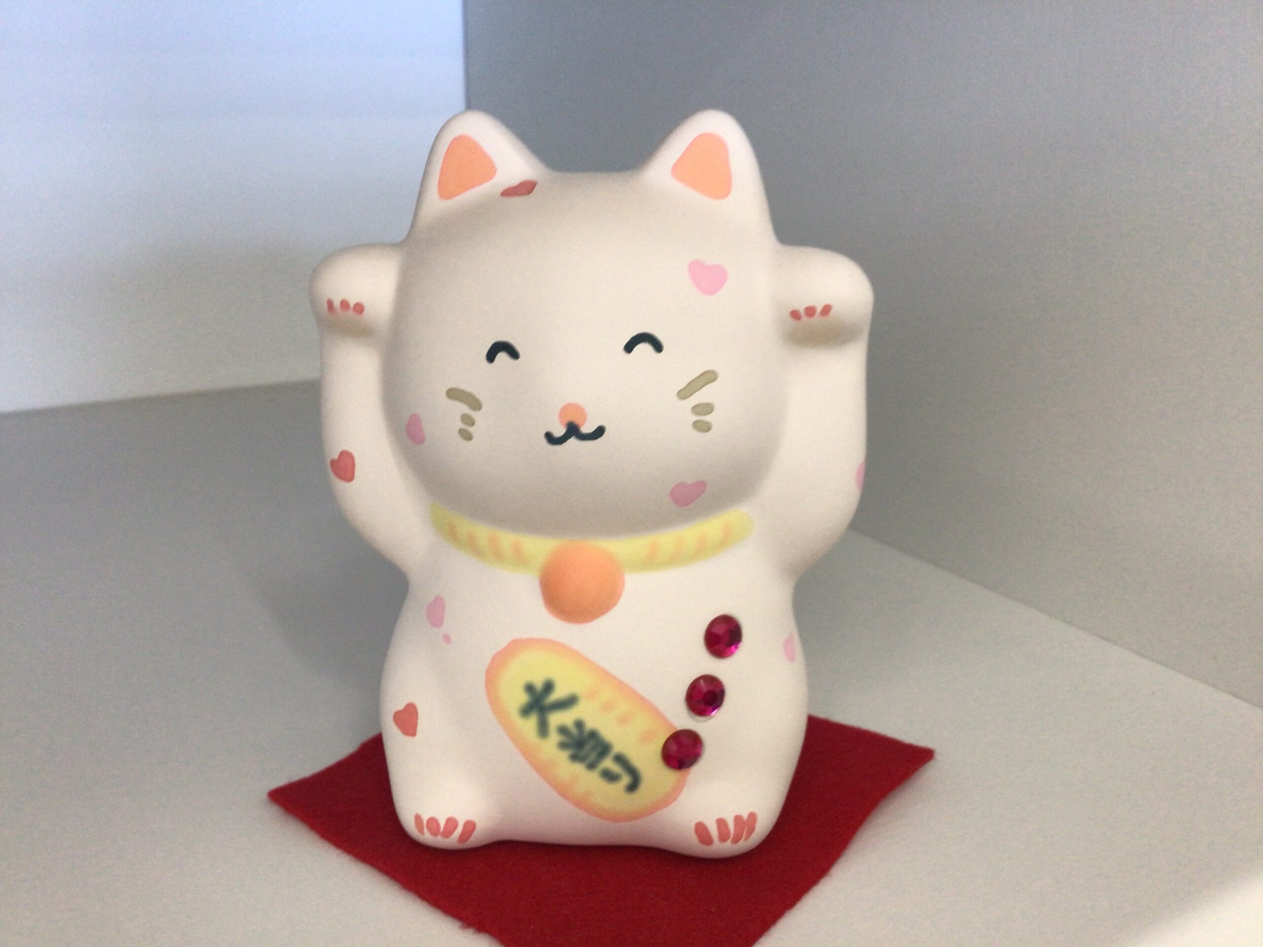 今年は幸運も金運もと、ちょっと欲張り両手を上げた招き猫にしたのですが、…。