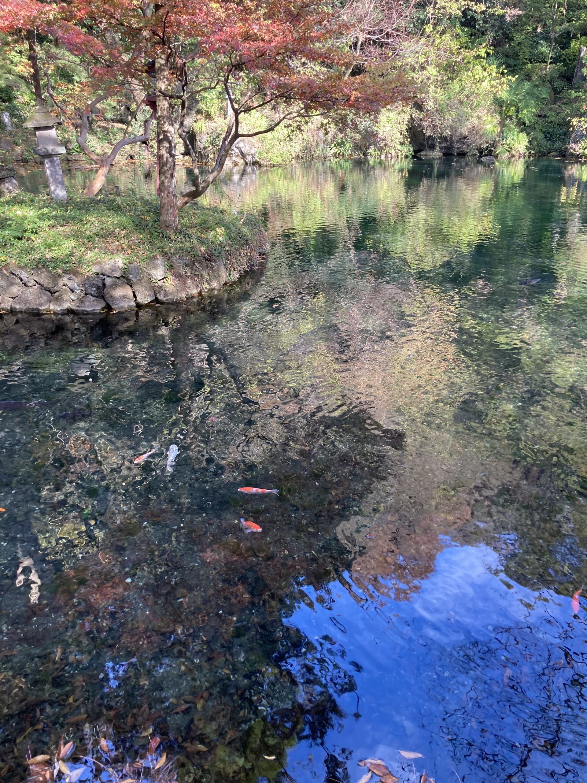 池水は底が見える程透き通っていました。山の上には磯山弁財天景色も眺めて良かったです。夜はライトアップもされてるそうです。