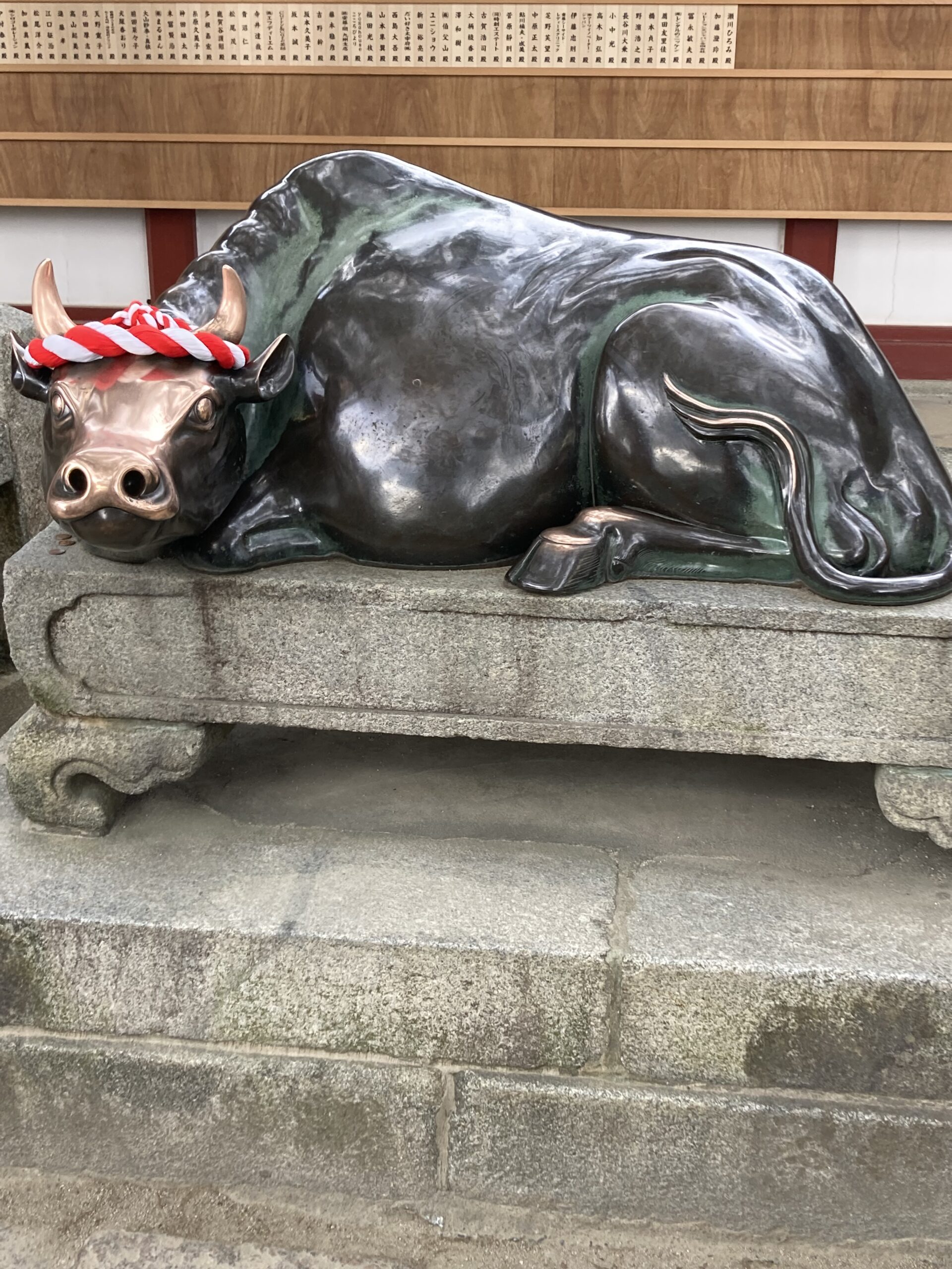 なかなか見ることができない建替え中、撫で牛をさすって梅ヶ枝餅を食べながら散策しました。梅の花はまだつぼみでした。