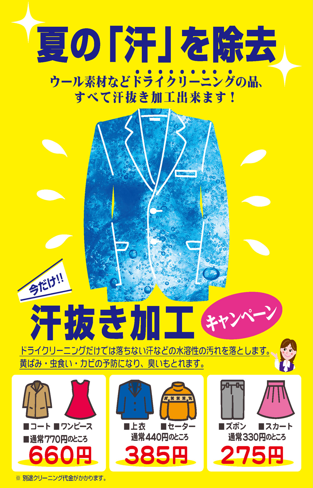 11/25(火)まで汗抜きキャンペーンを行います。「夏の汗、除去しませんか?」通常汗抜き価格の50円〜100円引きでお預かりいたします。